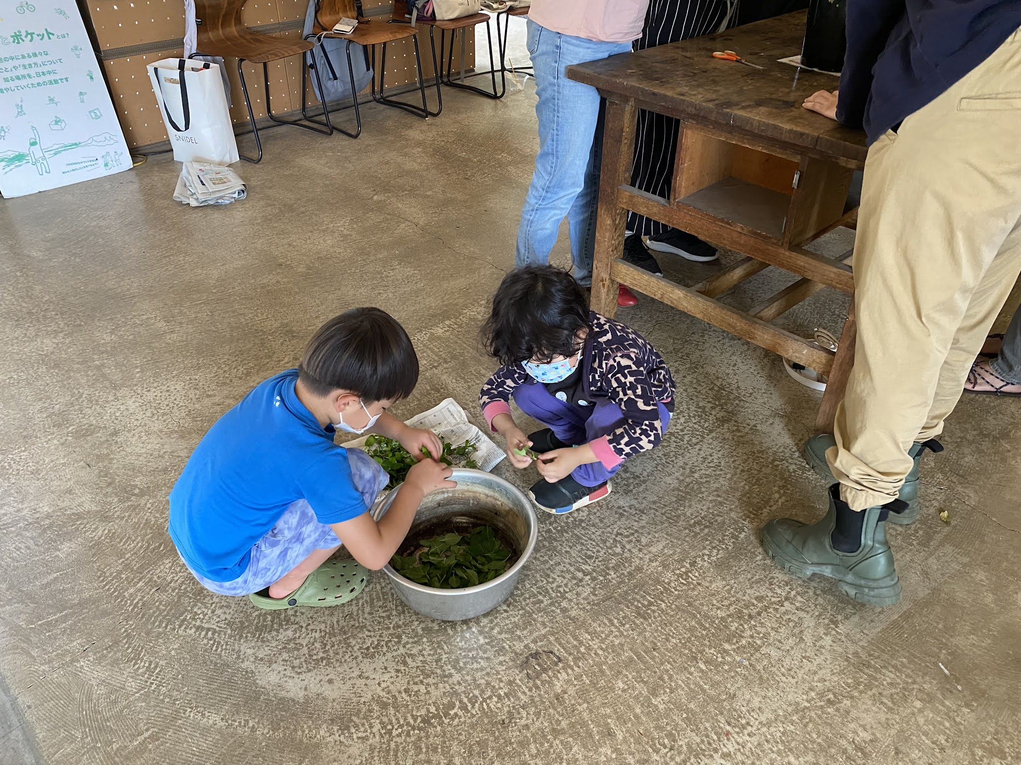 後半は、ちっちゃい葉っぱもたくさん集めて、浸し染め。ふきくんのシャツも青くなって、やったぜ!